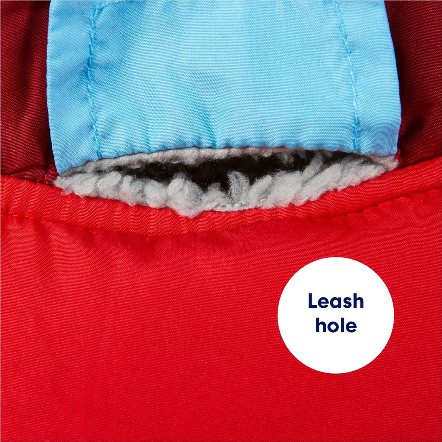 Remember to measure your pet for the perfect fit. Staying warm and looking cool are both effortless in this mediumweight pet coat from Frisco by Chewy. The color-blocked exterior features a retro style in an eye-catching color scheme pulled right off the runway. The adjustable straps and hook-and-loop fasteners at the neck and chest make it easy to get a snug, comfortable fit.