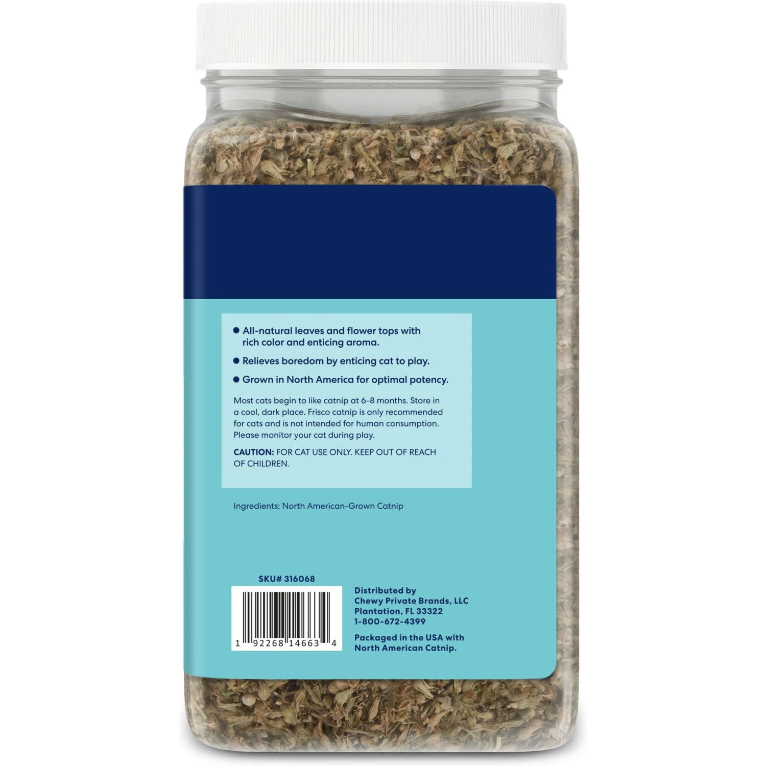 Frisco Natural Catnip, 2.25-oz — The tempting aroma of Frisco Natural Catnip will bring out the playful pet in every kitty! This 100% natural blend of leaves and flower tops—grown in North America for optimal potency, the richest color and strongest aroma—will entice any cat to pounce and play for hours and hours. Just pop off the top and your cat will come running, ready for all the feline fun.